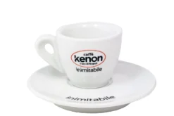 Verziert mit dem Kenon Logo und einem großen „K“ auf der Tasse sowie dem „inimitabile“ Schriftzug auf der Untertasse.