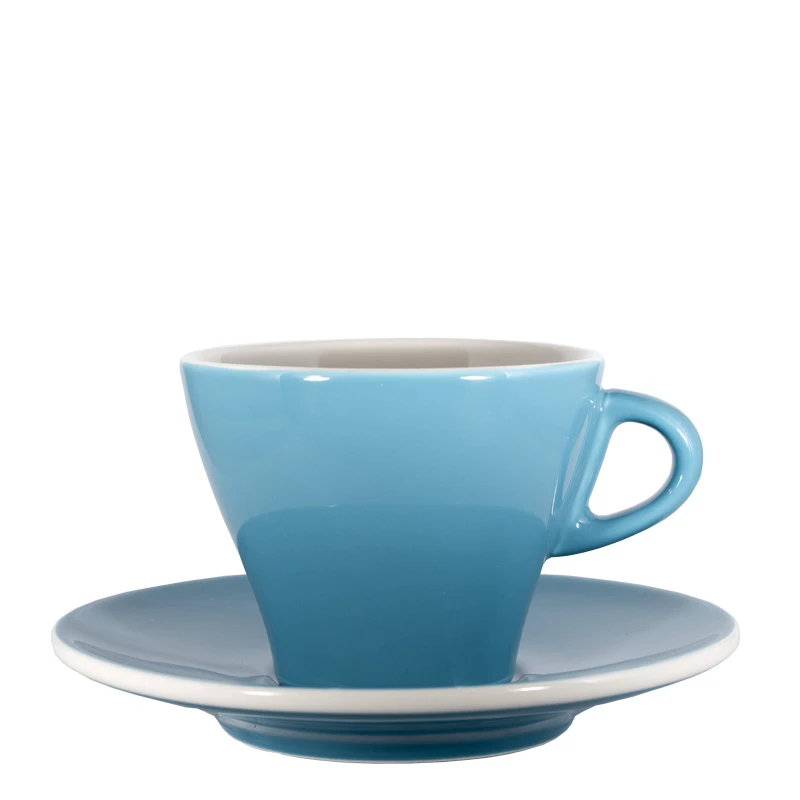 Bunte, hochglänzende Cappuccinotasse in geschwungener Form.