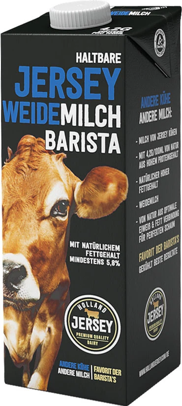 Diese Barista-Milch stammt von ganz besonderen Kühen – den Jersey Milchkühen. Sie stammen ursprünglich von der Kanalinsel Jersey. Ihr Fell ist typisch karamellbraun und ihre Nasen weiß. Im Gegensatz zu der Milch einer herkömmlichen Holstein Kuh, ist die der Jersey Kühe von Natur aus reicher an Vitaminen, Proteinen, Mineralien und Fett. Gerade das unterscheidet diese Milch besonders von allen anderen. Denn sie hat einen Fettgehalt von ganzen 6%. Und wie wir alle wissen ist Fett der beste Geschmacksträger, den es gibt. Das macht sie unglaublich cremig im Geschmack und der damit produzierte Milchschaum ist der Beste, den Sie jemals gesehen haben.